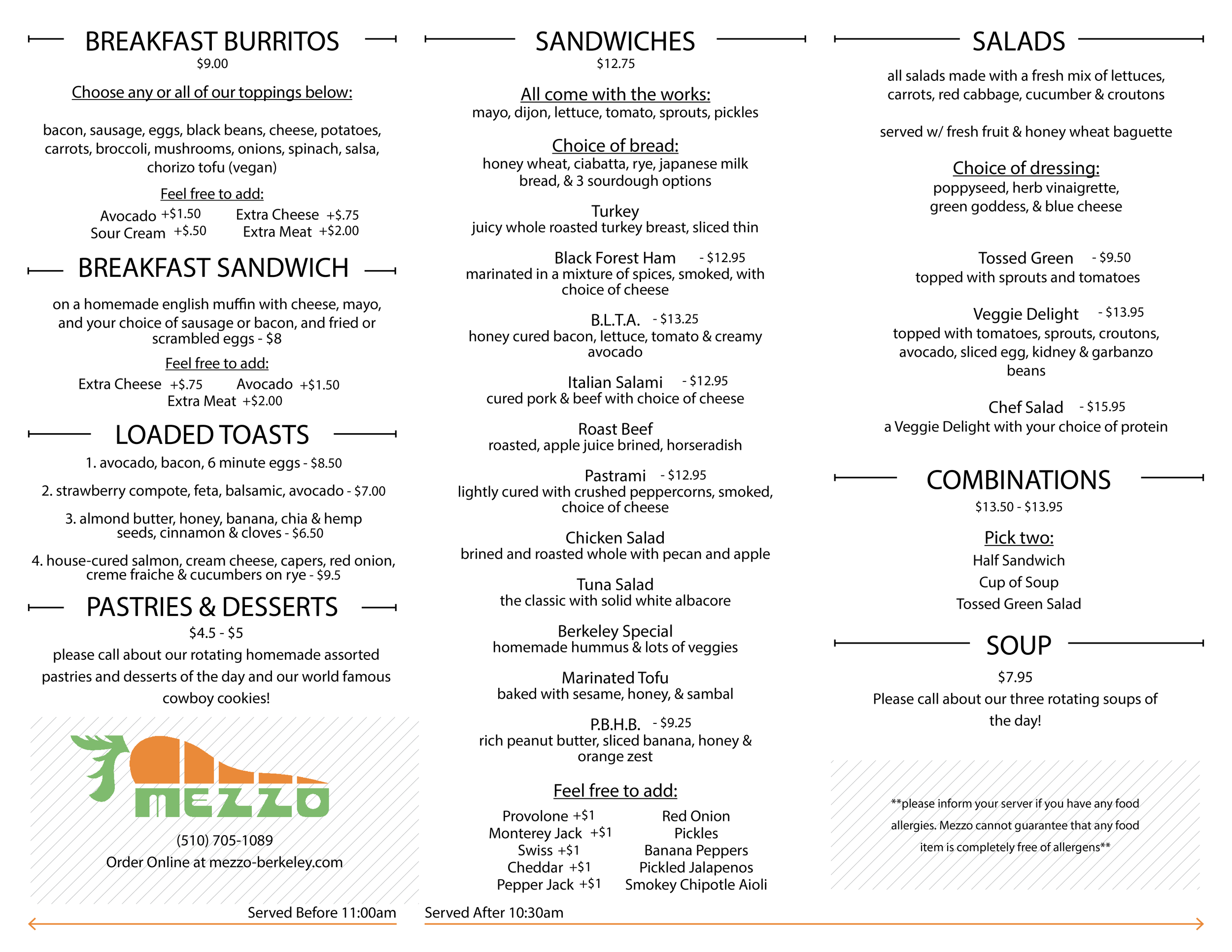 15% gratuity added to large orders. Please email us 24 hours in advance to place a large pick up order. mezzoberkeley@gmail.com